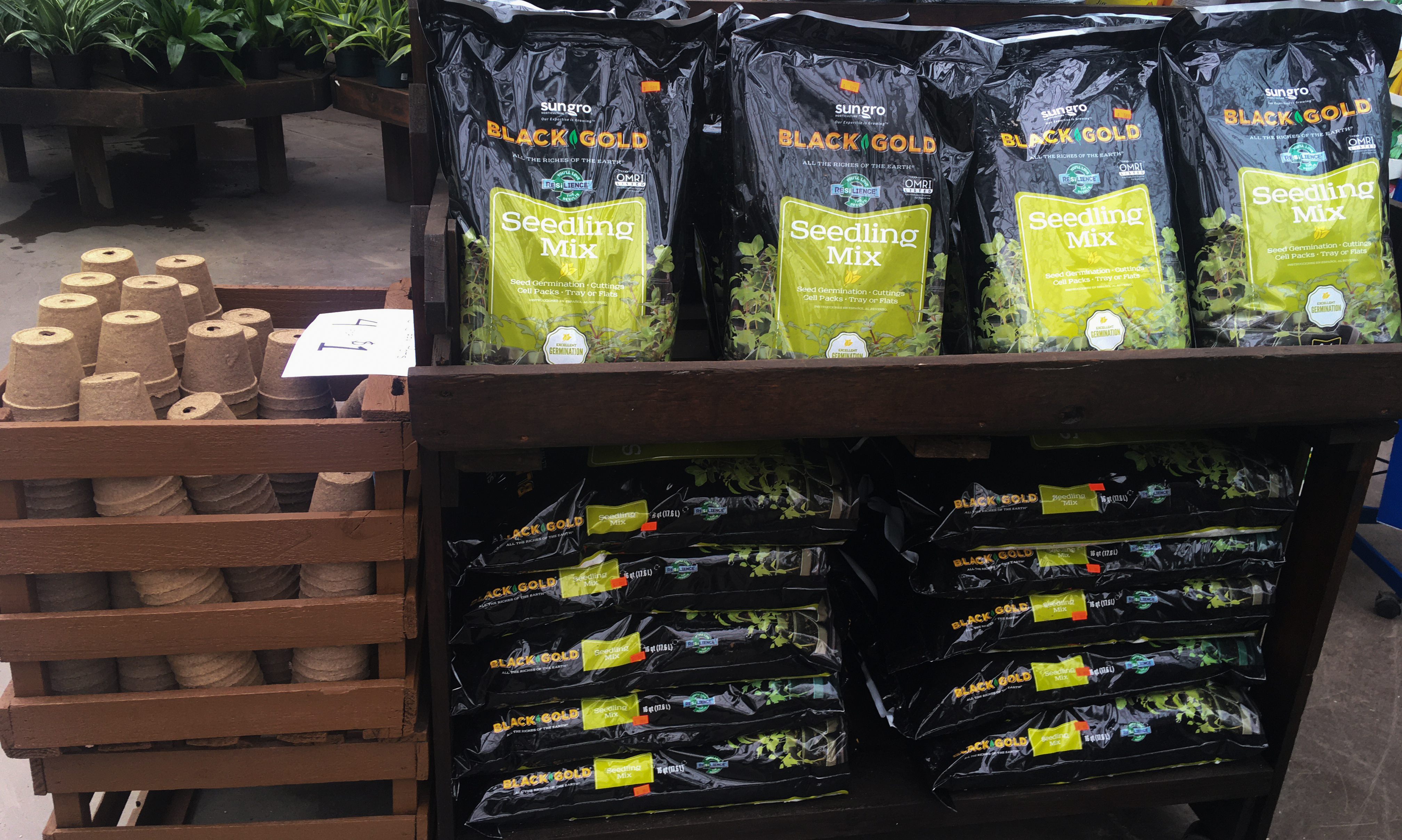 For specialty plants, we have 8 quart bags of cactus mix, african violet mix, orchid mix, moisture control mix, perlite, vermiculite, 2 quart bags of bonsai mix and fir bark, raised bed mix, and an excellent all-purpose mix